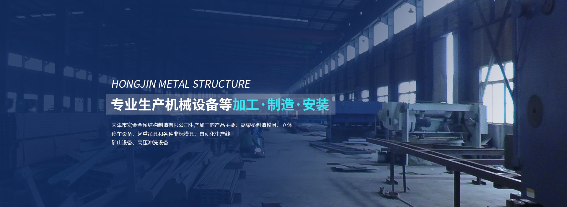 天津市宏金金屬結構制造有限公司生產加工的產品主要:高架橋制造模具、立體停車設備、起重吊具和各種非標模具、自動化生產線、礦山設備、高壓沖洗設備。